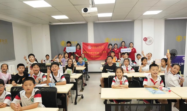 2023年7月8日下午,湖南工商大學前沿交叉學院“三下鄉”暑期社會實踐隊-HUTB護苗成長隊聯合長沙市天心區文源社區以“兒童普法先行,助力健康成長”為題展教育關愛志愿活動。活動圍繞反詐、反校園霸凌,開展了一堂生動有趣的科普課堂。