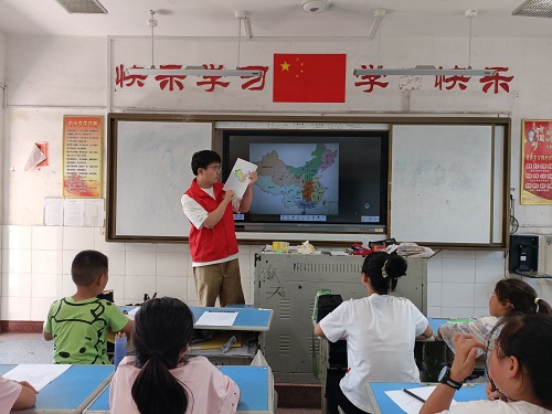 圖為志愿者服務隊成員在繪畫課上指導孩子們給中國地圖涂色。