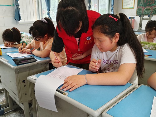 圖為書法課上,志愿者服務隊成員手把手親自教學。