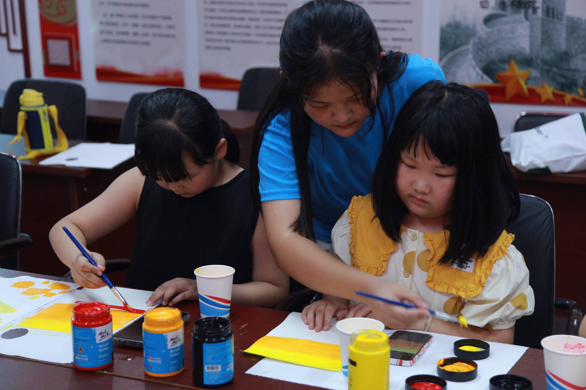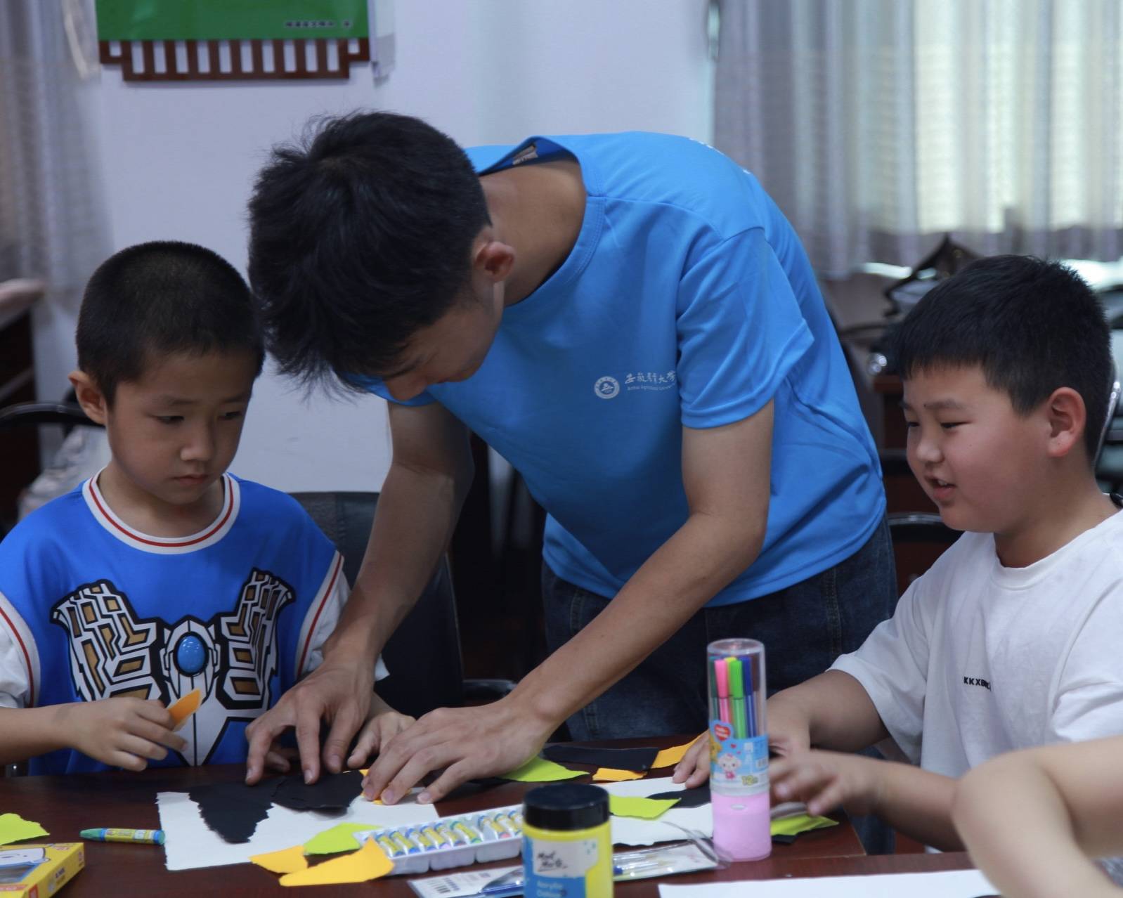 下午,為了培養(yǎng)孩子們的繪畫能力,讓孩子們認(rèn)識美、感受美、創(chuàng)造美,支教組再次前往中港社區(qū)開展美育活動。本次活動為繪畫課,分為色彩和造型兩個部分,支教組的主講老師首先以PPT形式進(jìn)行簡單講解。在掌握一些基礎(chǔ)知識后,支教組的小老師們開始分發(fā)材料,在鼓勵小朋友們動手實踐的同時在旁輔助。活動中孩子們的積極性很高,紛紛踴躍發(fā)言,也都樂在其中,展現(xiàn)出了精彩的畫面。活動的尾聲,孩子們都得到了小禮物作為獎勵,并且與小老師們留影紀(jì)念。