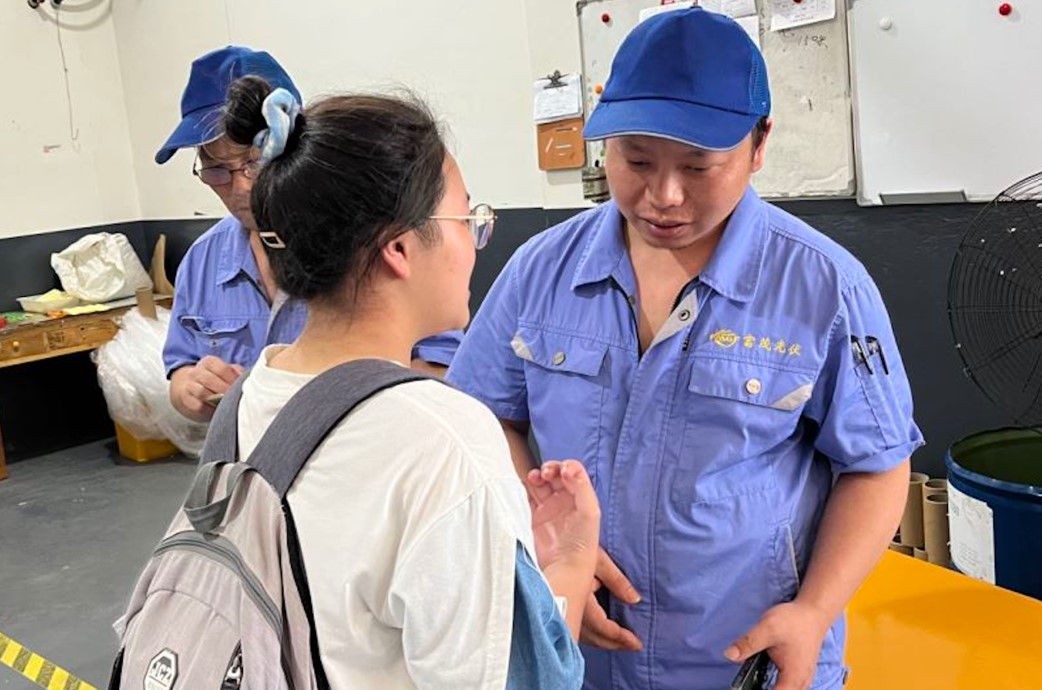 圖為實(shí)踐團(tuán)訪談游客 實(shí)踐服務(wù)團(tuán)供圖 在對企業(yè)周邊環(huán)境調(diào)查之后,實(shí)踐服務(wù)團(tuán)前往杭州富茂光伏材料有限公司展開實(shí)地調(diào)研。實(shí)踐團(tuán)到達(dá)后,在周總經(jīng)理的帶領(lǐng)下,邊講解邊參觀了整個企業(yè),其包括品檢、研發(fā)、營銷、生產(chǎn)四個部門,并重點(diǎn)了解了研發(fā)與生產(chǎn)兩個部門。研發(fā)部門通過與國內(nèi)外高等院校及科研所的合作,確保產(chǎn)品質(zhì)保合格的同時滿足各項(xiàng)檢測要求,創(chuàng)新EVA生產(chǎn)技術(shù)與水平;生產(chǎn)部門通過企業(yè)的精細(xì)化管理,實(shí)行兩班倒制度,以滿足EVA薄膜生產(chǎn)對技術(shù)與時間高要求,同時按照訂單需求及時調(diào)整人員崗位分配。此外,由于EVA薄膜的材料特性,在生產(chǎn)過程中貫徹綠色、創(chuàng)新的發(fā)展理念下,可實(shí)現(xiàn)無固廢生產(chǎn),具體措施可包括循環(huán)水冷卻等措施。