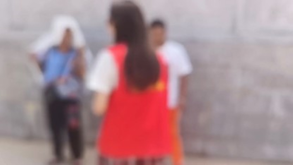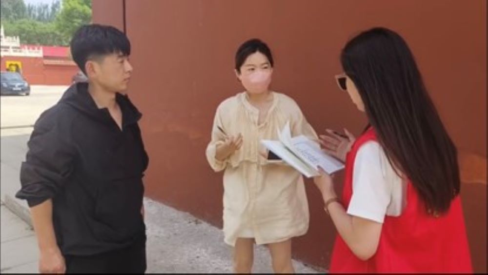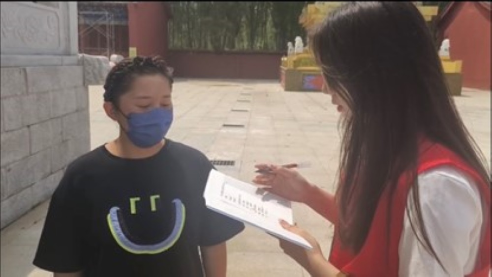 圖為隊(duì)員詢問游客對參觀吉祥密乘古建筑群的感受 中青網(wǎng)通訊員 劉世佳 供圖