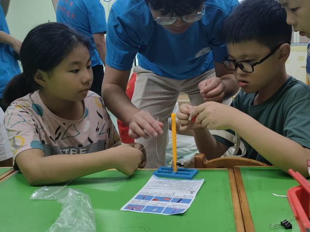 圖為實(shí)踐營(yíng)成員帶領(lǐng)兩名同學(xué)做簡(jiǎn)易升旗裝置。通訊員 徐冉 供圖