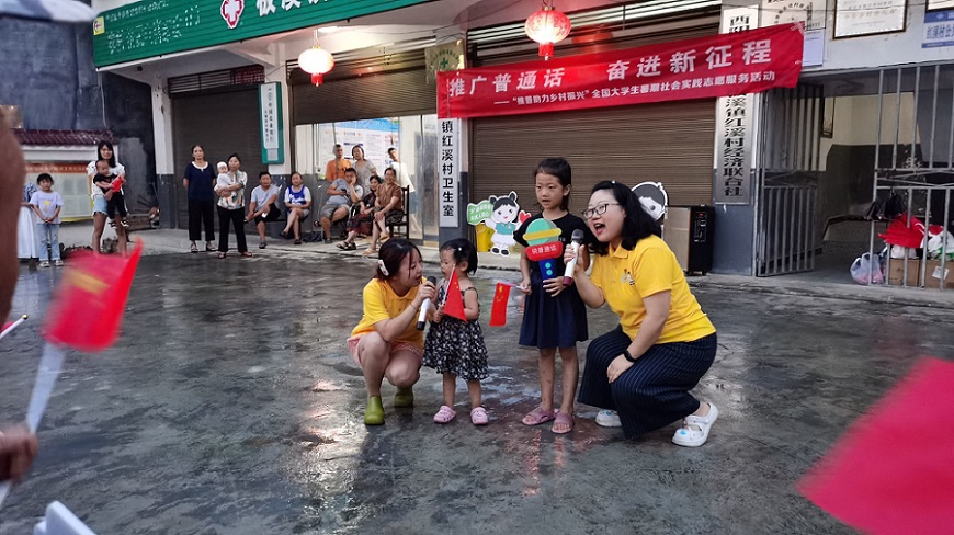 大雨過后村民們紛紛前來村委會活動場地,豐富多彩的文藝節目,包括歌曲、舞蹈、講座、故事會等,為現場觀眾呈現了一場感性與創意的視聽盛宴。同時,推普活動也在現場展開,團隊成員為村民和小孩提供了有趣的普通話學習互動,倡導廣泛使用普通話,促進語言交流和文化交流。
