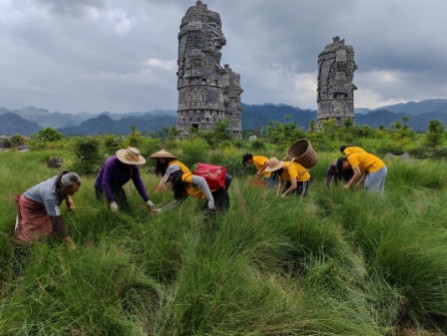 (圖片為篤行團(tuán)隊(duì)成員與景區(qū)工人一起拔草)