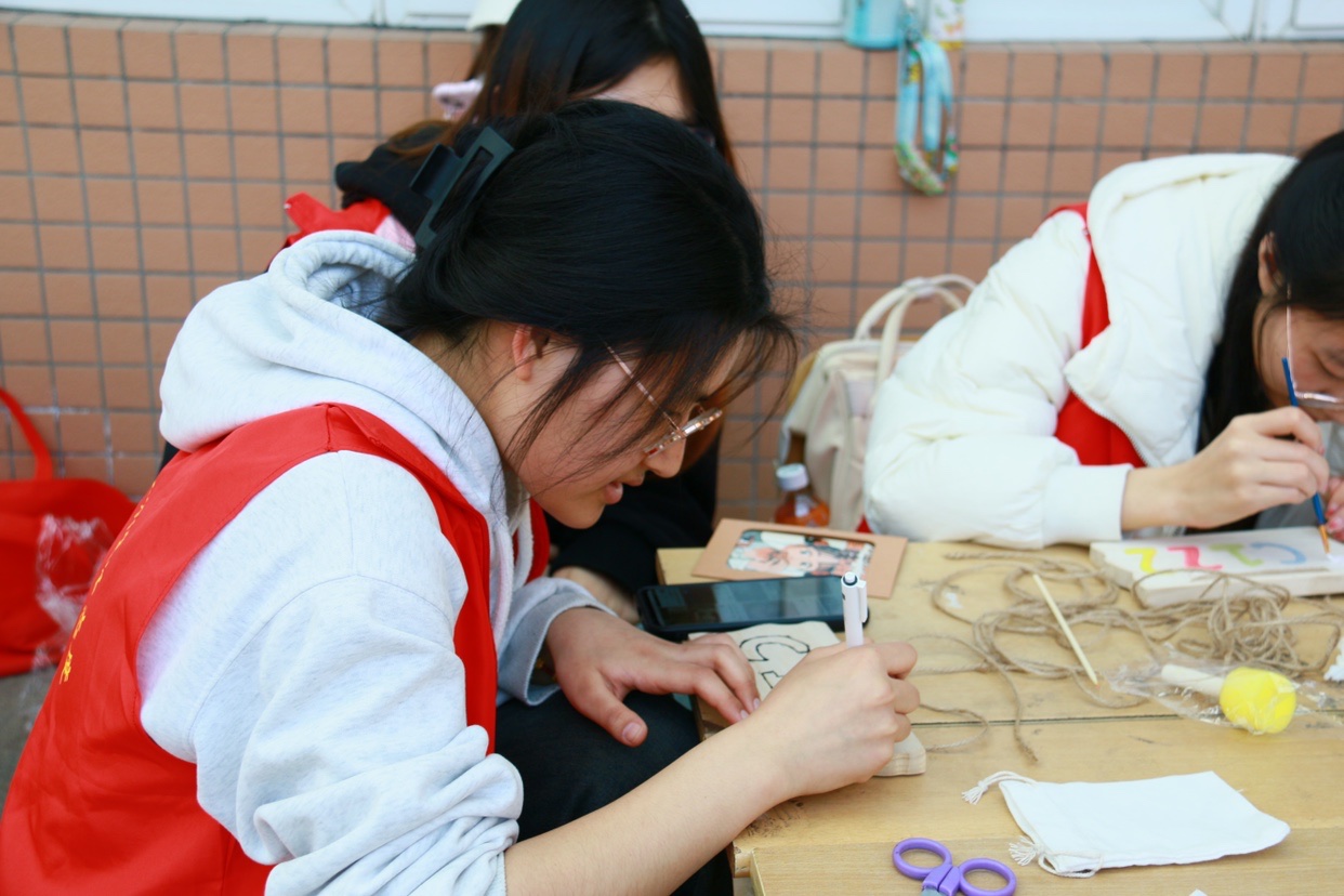 “e起反詐”志愿服務(wù)隊先以校內(nèi)反詐為主,除了在校內(nèi)播放宣傳反詐知識的音頻外,還參與了校園雷鋒集市活動。3月16日下午,志愿隊成員在校內(nèi)食堂門口準(zhǔn)備好了桌子、明信片、繪畫筆等等,大家可以在明信片上寫身邊的雷鋒事跡、反詐標(biāo)語,也可以自己DIY各種福袋、畫冊等等,吸引了大量同學(xué)參與。