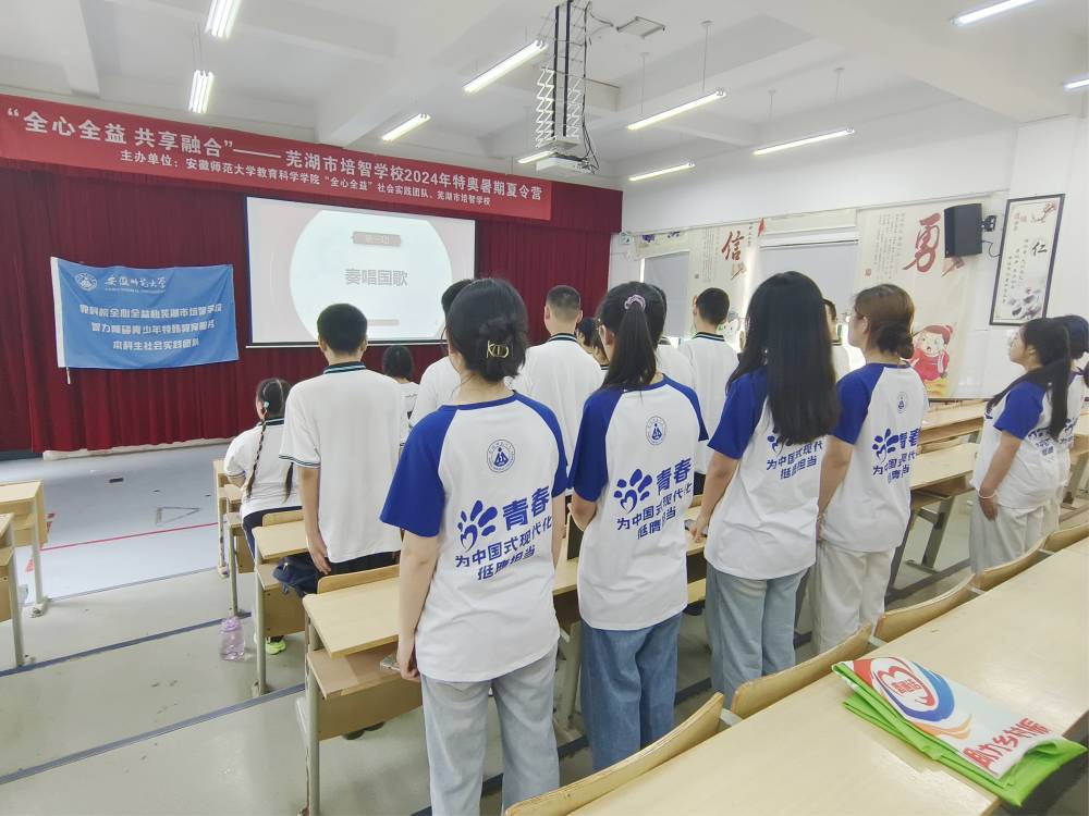 7月9日上午,實踐團隊于蕪湖市培智學校階梯教室正式舉行開班儀式,團隊指導老師金鳳仙、蕪湖市培智學校團支部書記張康、2023年實踐團隊隊長兼朋輩導生朱政、培智學校參加活動全體學生以及實踐團隊全體隊員參與本次開班儀式。