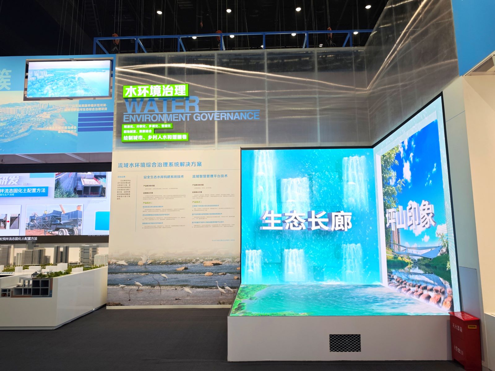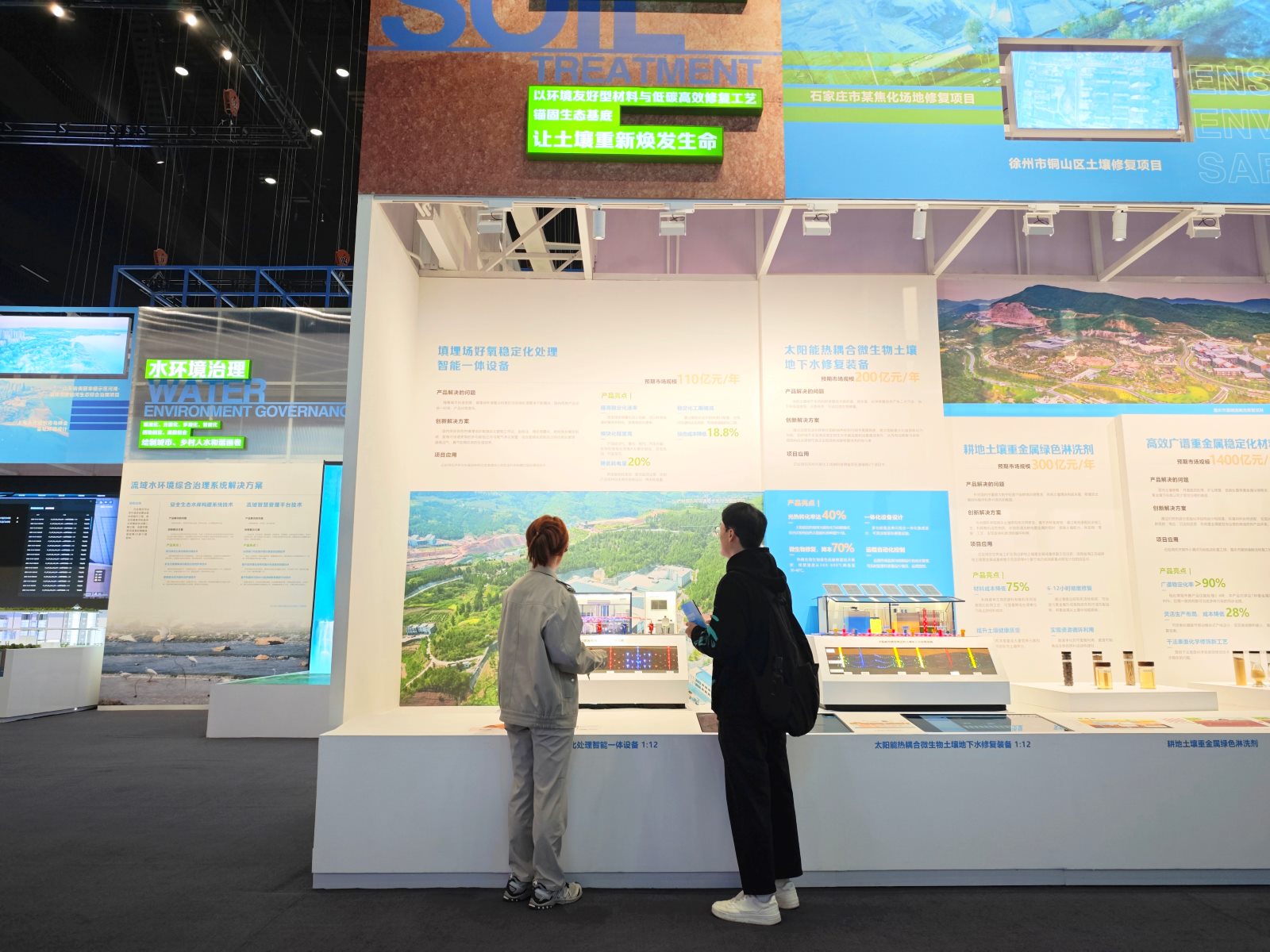 進入展廳,我先來到了土壤治理的展位,在工作人員的講解中,我了解到國內有大量的中輕度污染耕地,耕地治理需求很大,而傳統的土壤清洗劑成本又高,同時修復后的土壤結構和養分存在損失的問題,經過國內技術研發,現在創造出了一種耕地重金屬綠色淋洗劑,將含有綠色淋洗劑的自來水灌溉到耕地中,一部分滲透到土壤里,清洗劑會吸附土壤里的污染物,落到土壤下方提前用秸稈鋪好的管道中,通過管道排出來,吸附污染物的清洗劑經過凈化后可以再次利用。這種產品的材料成本降低了75%,能在6-12個小時內將重金屬從土壤中徹底移除,而清洗劑本身含有大量營養元素和有機質,修復的同時能夠補充土壤養分;廢液經過凈化后還可以重復利用。我不由贊嘆,科技的進步真是越來越快!