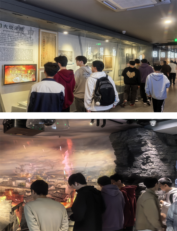 參觀過程中,同學們對照著心中的思考提綱,帶著“何謂愛國?”、“青年何以報國?”等深刻命題,走進了那段波瀾壯闊的歷史。展柜中,辛亥革命志士的宣言手稿,令人遙想起那個風云激蕩的時代里青年們的熱血與決絕;一幅幅描繪抗日戰爭與解放戰爭的老照片,先烈們為家國存亡所展現出的浴血奮戰和犧牲精神,更讓所有人為之動容。從鴉片戰爭的國門被強行轟開,到最終迎來解放的勝利凱歌,這段發生在腳下這片土地上的、不屈不撓的奮斗史詩,給每一位團員帶來了直擊心靈的思想洗禮。在隨后的交流中,大家紛紛感慨,此行讓“愛國”二字從一個宏大的概念,具象化為對歷史的銘記、對先烈的敬仰和對腳下土地的責任,從而更加深刻地體悟到新時代青年所肩負的“繼往開來”的歷史使命,信念因此愈發堅定。