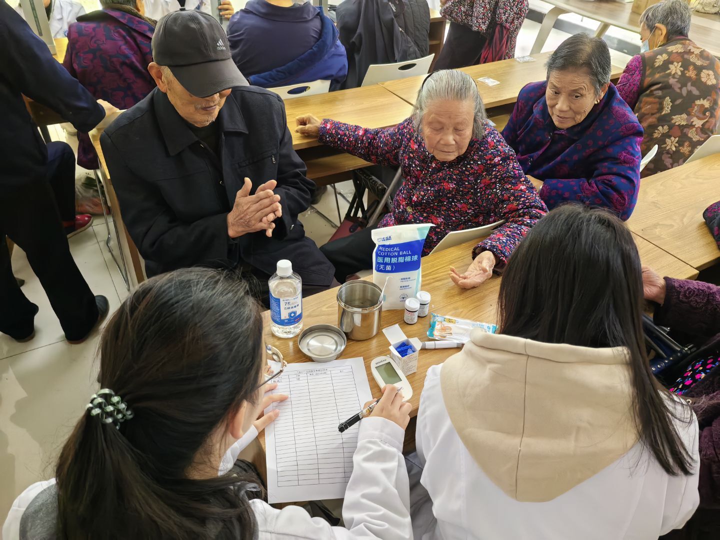 活動現場,推拿區志愿者們提前準備好推拿用的推拿布,防止在按摩時讓老人感到不適。按摩區志愿者以小魚際,大魚際,一指禪等手法去按摩老年人肩頸部位風池穴、肩井穴去緩解肩頸僵硬,還通俗講解穴位作用。測量區志愿者一邊細心地為老人測血壓、測血糖,一邊耐心記錄數據并給出健康建議。其次,我們還開展了預防三高的宣講活動,我們從中醫“治未病”理念入手,用通俗的語言講解高血壓、高血糖、高血脂的中醫成因,還結合季節特點,分享了飲食調理(如芹菜、山楂等食材的養生用法)、穴位按摩、八段錦簡易動作等預防“三高”的實用妙招