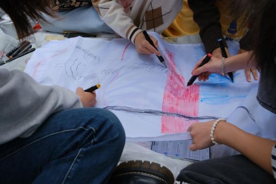 圖為團員們正在繪制紅色主題隊旗。呂浩睿 供圖
