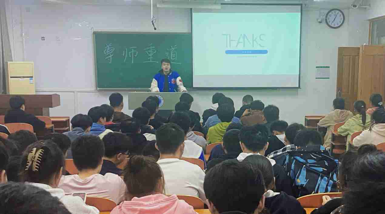 接著陳杰分享了一些愛師崇教的典故,比如程門立雪、白首北面等,隨后同學們開始分享自己了解到的一些老師的事跡:在生死安危面前河南教師李芳以血肉之軀為學生擋開車輛的沖撞;河北農業大學教師李保國扎根太行山區,帶領農民脫貧;廣西教師石蘭松義務撐船26年,只為護佑1000多名孩子能夠正常上學。最后陳杰提醒同學們,見到老師要及時主動問好,要懷著感恩的心情,以飽滿的精神面貌認真對待老師給我們上的每一堂課。