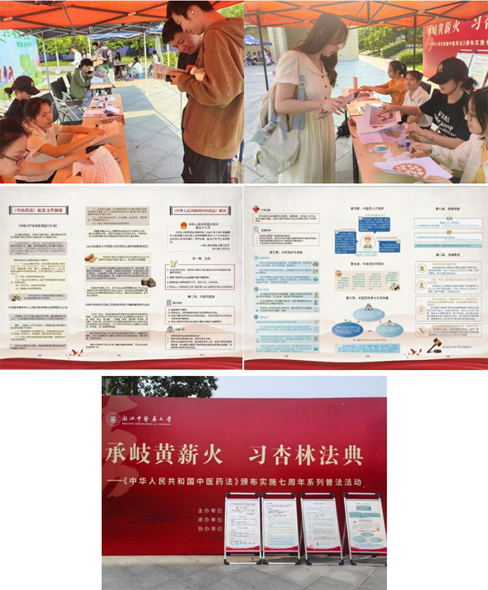 《中華人民共和國中醫(yī)藥法》是我國中醫(yī)藥領(lǐng)域第一部綜合性、全局性、基礎(chǔ)性的法律,自2017年7月1日正式實施,成為中醫(yī)藥發(fā)展史上具有里程碑意義的法典。2024年是《中醫(yī)藥法》頒布實施的第7個年頭,為更好地傳播中醫(yī)藥文化,普及中醫(yī)藥保健知識與法律條例,浙江中醫(yī)藥大學人文與管理學院普法協(xié)會聯(lián)合院志愿者協(xié)會及第三臨床醫(yī)學院晨曦針推醫(yī)院共同舉辦了