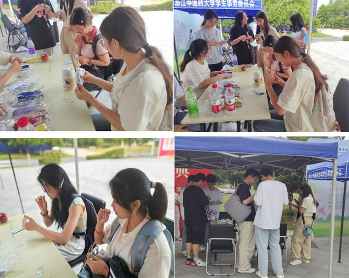 “青春護航,健康至善”志愿服務(wù)系列活動 為提高同學們的胃病預(yù)防知識,普及養(yǎng)胃、護胃健康理念,讓大家認識到保護腸胃健康的重要性,普法協(xié)會與志愿者協(xié)會進行合作,開展“青春護航,健康至善”志愿服務(wù)系列活動。在活動現(xiàn)場,志愿者們認真科普預(yù)防和治療幽門螺旋桿菌的相關(guān)知識,并細心為師生們做試紙檢測、辨別檢測結(jié)果。現(xiàn)場還準備了艾草錘材料包,吸引了許多同學前來參與,為自己定制一個專屬健康艾草捶。使用艾草錘可以促進氣血循環(huán),活絡(luò)筋骨,志愿者們向大家現(xiàn)場展示并科普了“拍八虛舒經(jīng)絡(luò)”養(yǎng)生法及保健作用,呼吁大家一起尋找健康生活方式。