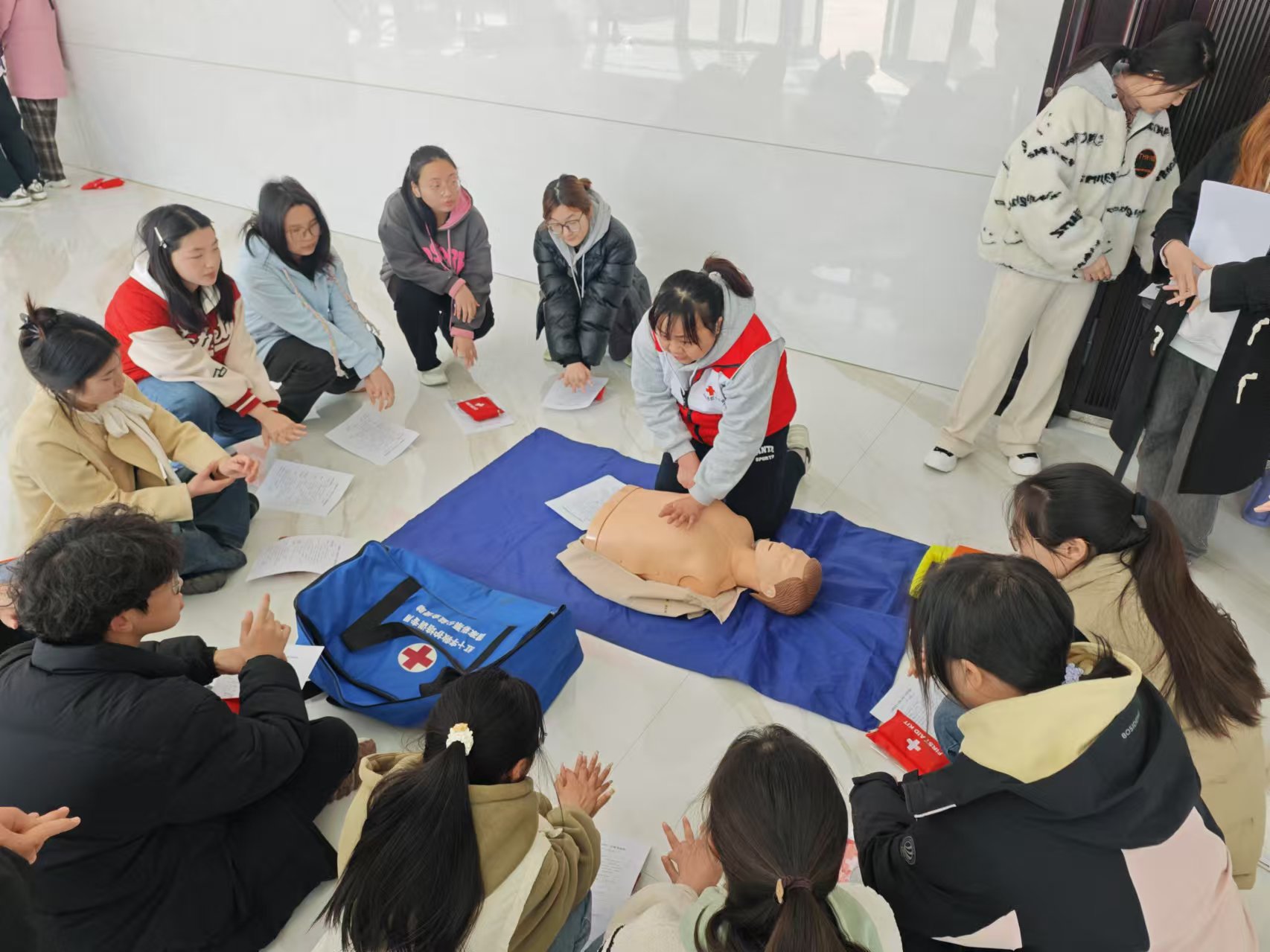 下午,實操培訓在公共衛生與健康學院大樓一樓開展。學員分組在紅十字老師的指導下練習心肺復蘇(CPR)、繃帶包扎等技能,紅十字會老師全程協助指導,通過“示范操作-分組練習-逐人考核”的流程,確保每位學員規范掌握急救手法。