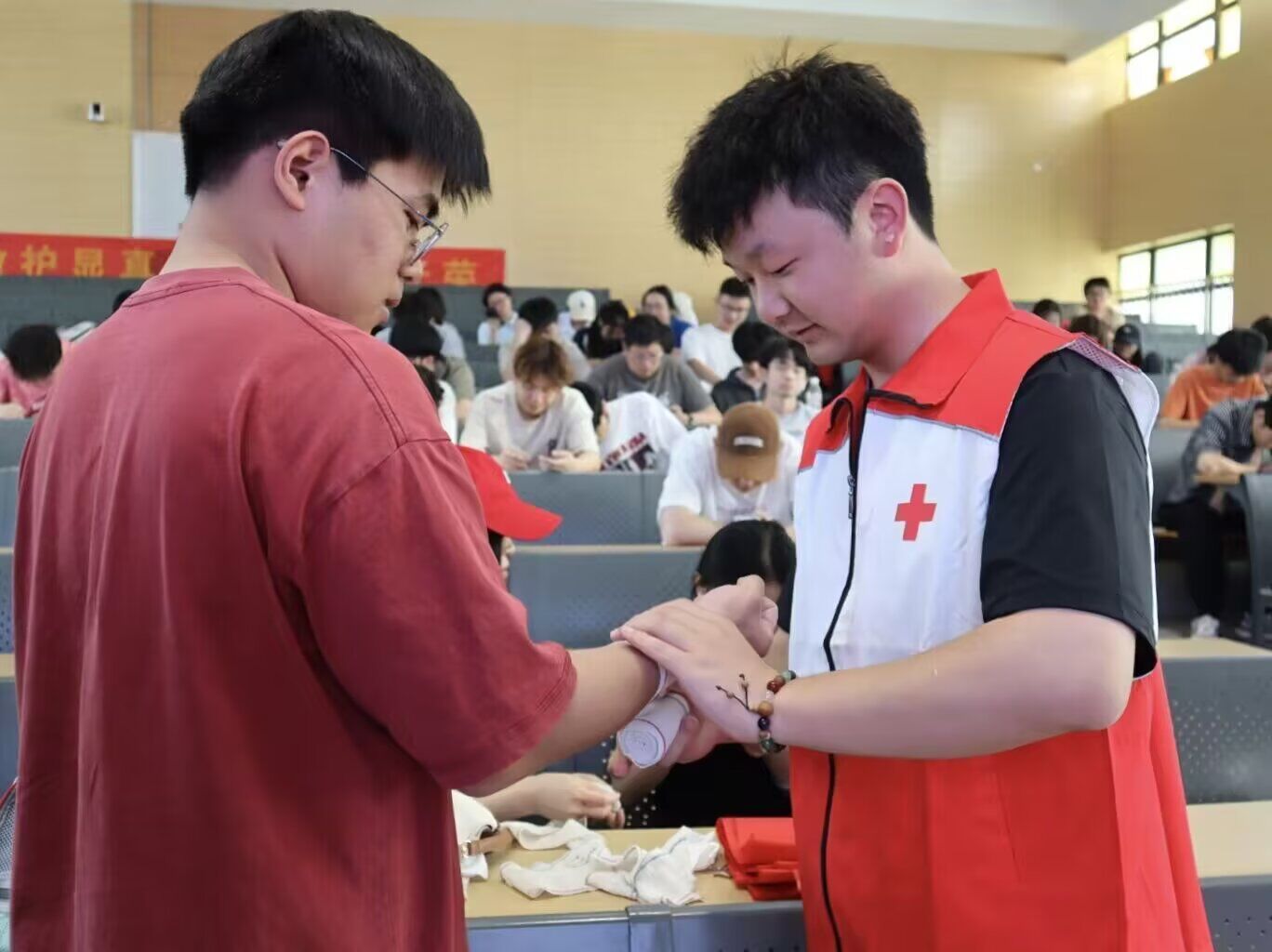 圖為志愿者指導(dǎo)同學(xué)使用繃帶。彭思楠 拍攝