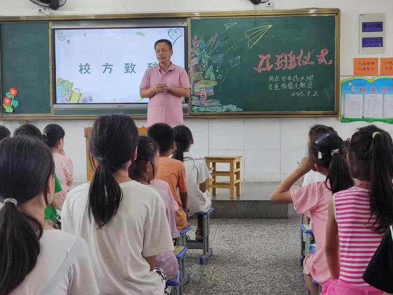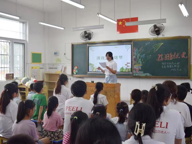 南京中醫藥大學南星伯藜支教團暑期夏令營活動在教室舉行開班儀式,活動由四個部分組成,由支教團成員姜嘉欣主持。