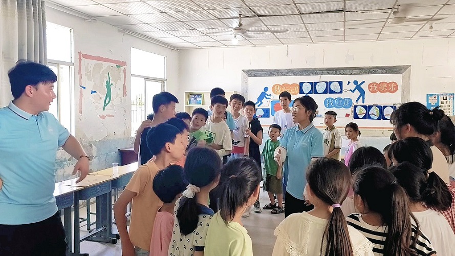 7月9日上午,隊長張喜毓帶領支教團的成員們與劉染小學的小朋友們相互介紹認識對方。在這個互相陌生的環境中,支教團采取了一系列有趣的活動來快速消除職教團與小朋友之間的隔閡。成員賀省華組織了一場破冰之旅活動,通過一系列趣味小游戲,將小朋友們的熱情迅速點燃。