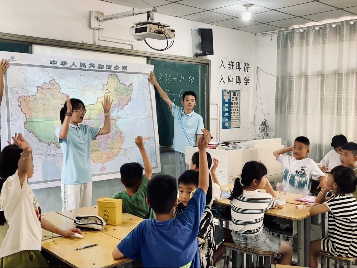 下午三點(diǎn)半,放眼望去,小朋友們正在埋頭急書(shū)暑假作業(yè),支教團(tuán)成員模仿著兒時(shí)老師的模樣,為同學(xué)們解決疑難問(wèn)題。那一瞬間,仿佛兩道身影跨越時(shí)間和空間的距離碰撞在一起,剎那間,眼前仿佛就不是現(xiàn)在的孩子們,而是小學(xué)時(shí)候和藹可親的老師。