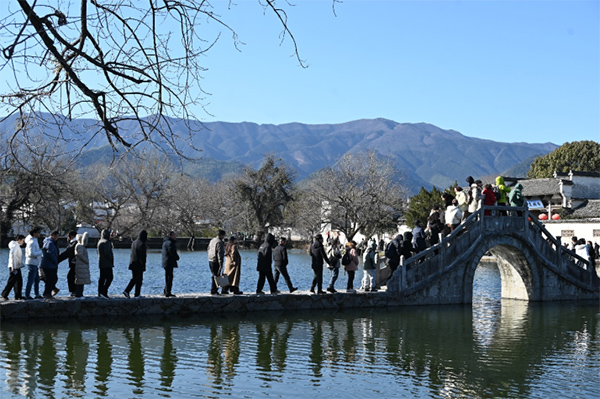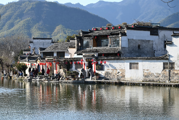 踏入宏村,首先映入眼簾的,是那汪如鏡的南湖。湖水悠悠,倒映著白墻黛瓦的徽派建筑,錯落的馬頭墻在碧波中蜿蜒,似是時光書寫的古老韻律。岸邊的古樹虬枝伸展,雖冬日枝椏光禿,卻添了幾分蒼勁古樸,與遠處層巒疊翠的山巒呼應,勾勒出天然的山水構圖。
